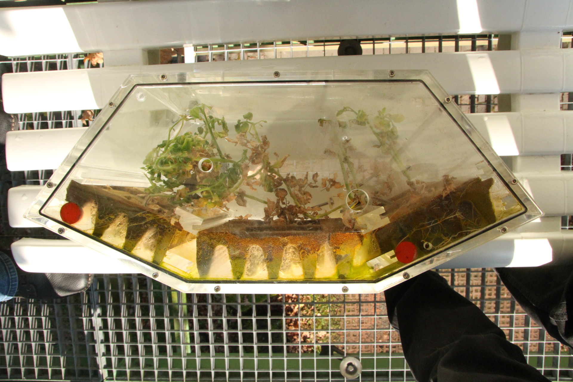 ‘With this experiment, we want to see whether it is possible to take plants into space in compact systems and use them appropriately in air, water and urine recycling. This would be very useful for a long-term mission,’ explains Dr. Sebastian M. Strauch from the working group led by PD Dr. Michael Lebert from the Division of Cell Biology at FAU. The greenhouse system contains all of the nutrients which the tomato plants need. The water comes from a tank; the fertilizer is created within the ecosystem. Artificial urine is added to the cycle at regular intervals and broken down into nitrates by bacteria in the filter.