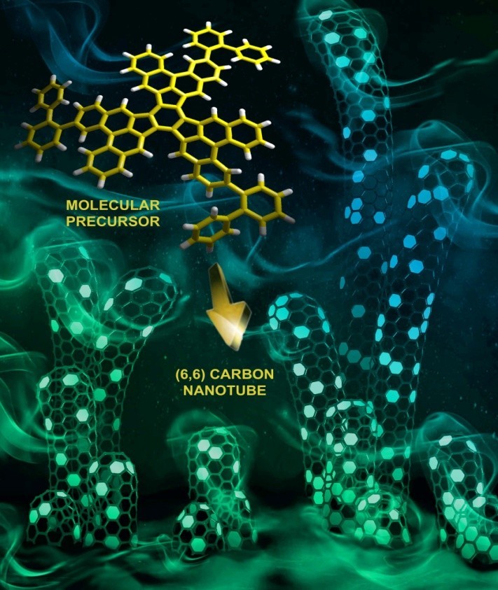 A team of researchers led by Dr. Konstantin Amsharov at the Chair of Organic Chemistry II and his colleague Prof. Dr. Roman Fasel from Empa (Swiss Federal Laboratories for Materials Science and Technology) have succeeded in creating single-walled and largely defect-free carbon nanotubes with a defined chirality from molecular precursors in a controlled way. These precursor molecules form a kind of seed on a platinum surface which helps a flat sheet of carbon atoms to form a tube. The researchers expect that they will soon have enough of these nanotubes to carry out detailed experiments on them and test their properties.