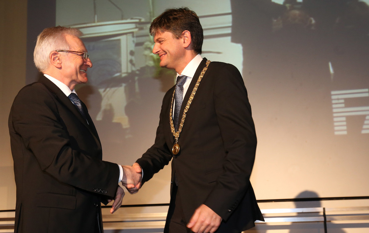 Professor Grüske’s humorous and anecdotal address was underpinned with experiences representing some of the most important milestones from his term of office, including targeted strategies, internationalisation, the academic environment, and construction and renovation work. In closing, Professor Grüske handed the chain of office to his successor with the parting words: ‘The presentation of the chain of office to the 154th incumbent symbolises a change of leadership which I feel is a positive step for the university and I undertake this last official act with great pleasure.’ He handed over the podium to his successor with a cheerful parting.
