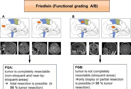 The Friedlein Grading A/B (FGA/B) classification system – named after the physician Katharina Friedlein – is a quick and precise way of determining whether surgical removal is the best possible treatment method for a given tumour. Essentially, the Erlangen-based doctors classify tumours according to their position in the brain in the context of a routine magnetic resonance imaging (MRI) scan. Tumours that are not located in functional brain regions or that are located at a certain distance from such regions are classified as FGA, while tumours that are close to or inside a functional brain region are classified as FGB.