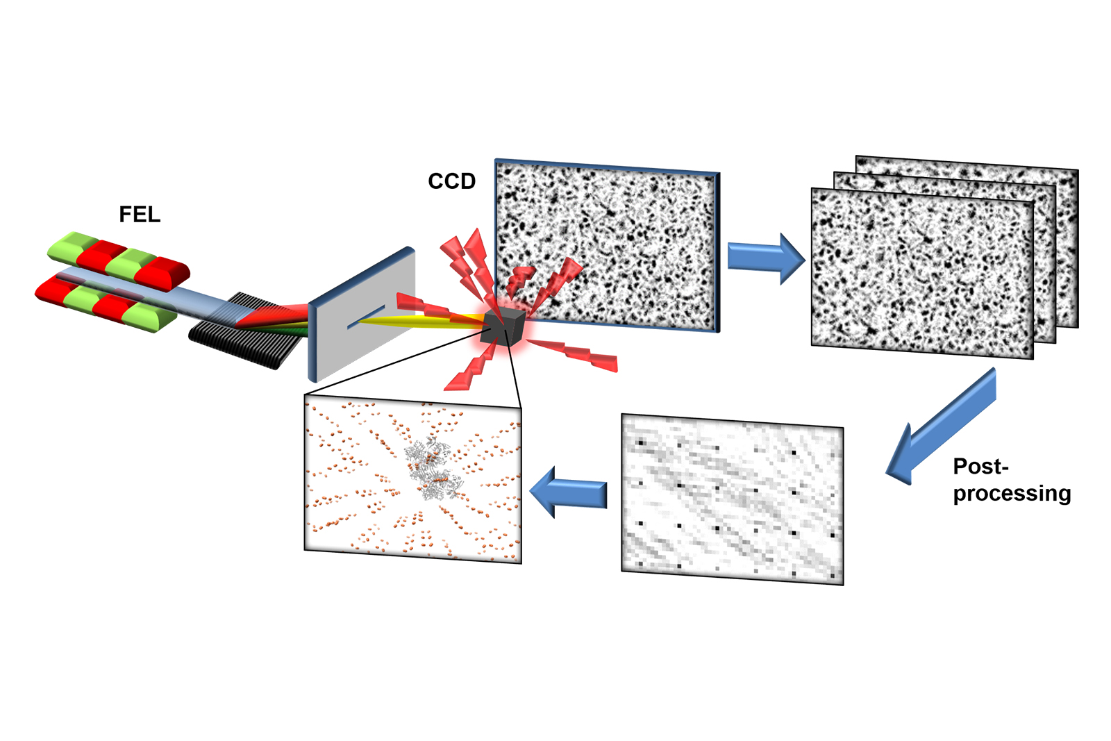 Since the new method uses fluorescence light, a much stronger signal than before can be obtained, which is also scattered to significantly larger angles gaining more detailed spatial information. In addition, filters can be used to measure the light of specific atomic species only. This makes it possible to determine the position of individual atoms in molecules and proteins with a significantly higher resolution compared to coherent imaging using X-ray light of the same wavelength. This method could give new impetus to the study of proteins in structural biology and medicine.