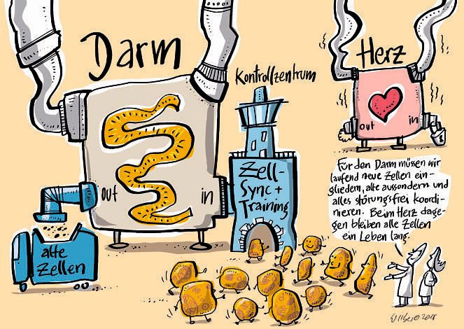 Cells die, cells regenerate – both are crucial processes for the survival of the human organism. As knowledge advances, we are gaining ever greater insights into the correlation between cell death and cell regeneration. Such finely balanced mechanisms can be observed in extremely short-lived intestinal cells as well as in heart muscle cells, which can live an entire human lifetime. The team headed by Christoph Becker, professor for molecular gastroenterology at Department of Medicine 1 at Universitätsklinikum Erlangen, is investigating intestinal cells. Researchers led by Felix Engel, professor for experimental kidney and vascular research at the Institute of Pathology, have specialised in helping hearts damaged by heart attacks beat again.