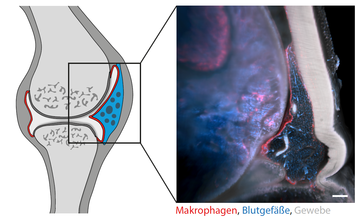 We still do not know exactly what causes chronic inflammatory joint diseases such as rheumatoid arthritis. A team at Universitätsklinikum Erlangen and Friedrich-Alexander-Universität Erlangen-Nürnberg (FAU) led by Prof. Gerhard Krönke has now chosen a new approach to gain a better understanding of the underlying mechanisms. Using technology they have developed themselves, Stephan Culemann and Dr. Anika Grüneboom from the Department of Medicine 3 – Rheumatology and Immunology have succeeded for the first time in making inflamed joints transparent, allowing them to be investigated using three dimensional molecular imaging. The insights thus gained into the complex working of our immune system were published in the magazine ‘Nature’.