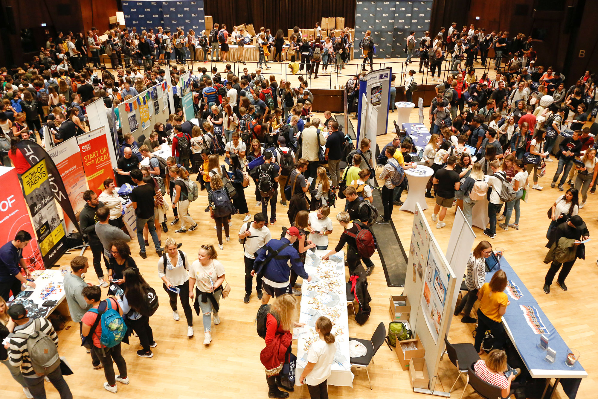 Students face a number of changes when starting university: new life, new friends and a new city. In order to help new students settle in at FAU this winter semester, FAU President Prof. Dr. Joachim Hornegger invited them to the official welcome event on 14 October in the Heinrich Lades Halle in Erlangen. Students were not only able to grab one of the popular blue FAU bags, it was also the perfect opportunity to find out a lot of useful information all about student life. More than 50 stands gave the new FAU students an overview of the various services available at the University such as the University Library, the Computer Centre, the Language Centre and the Sports Centre. A number of student initiatives, Student Services and various foundations also advertised their services.