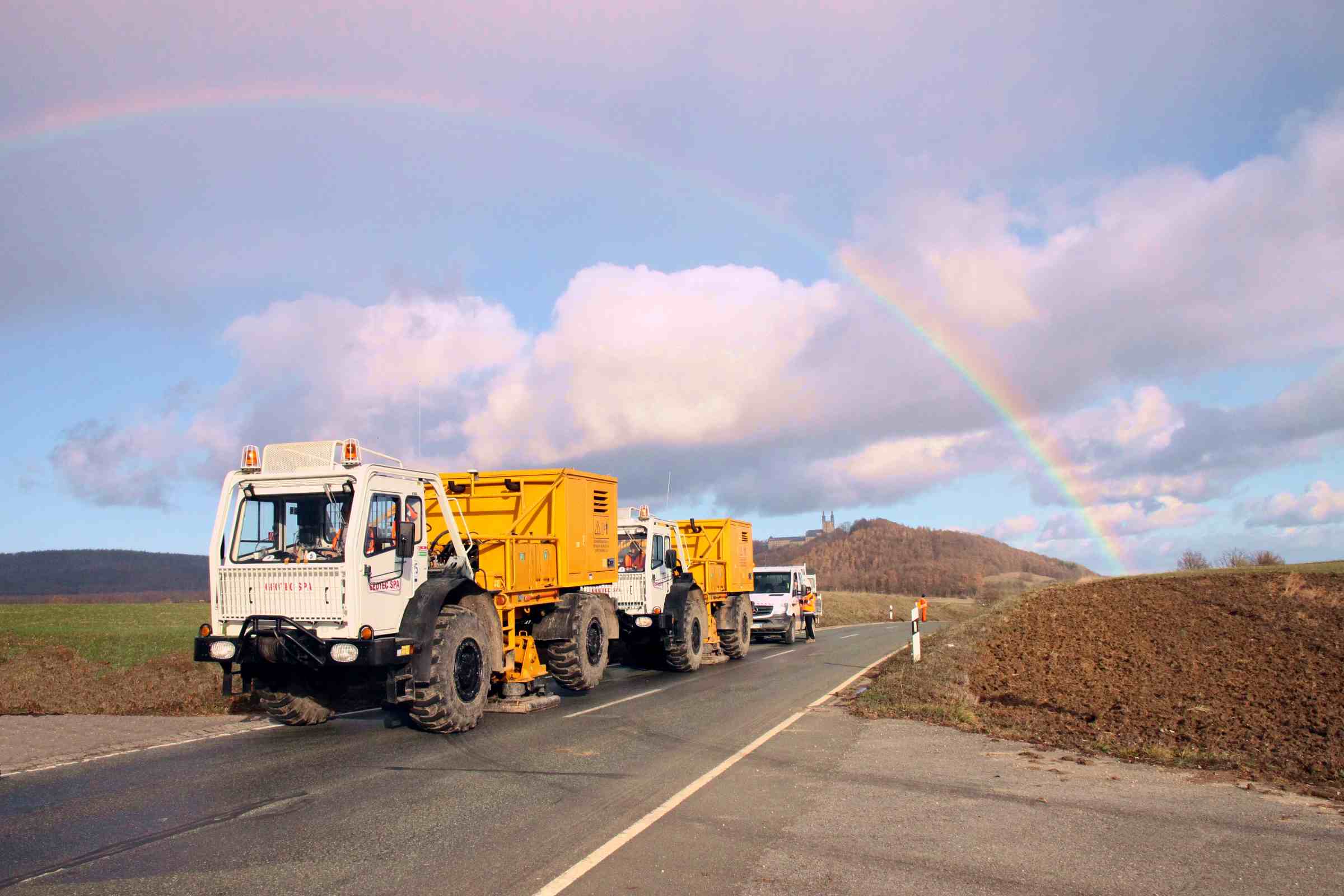 Exploratory work commissioned by FAU’s GeoZentrum Nordbayern and carried out by a private company at the end of 2018 will hopefully indicate which of these two possibilities might apply: Using three 20-ton trucks, a heavy plate was pressed into the ground in this area at fixed intervals along four lines with a total length of 230 kilometres and oscillated at frequencies of between eight and 64 Hertz. Some of these frequencies are below our hearing threshold, others can be perceived as a very deep hum. The waves triggered in this way are reflected in the substrate at the boundary where two layers with different properties meet. The researchers use geophones – measuring devices stuck into the ground – to record the waves reflected in this way and can determine the distance and therefore also the depth of such a boundary from the signal’s reflection.