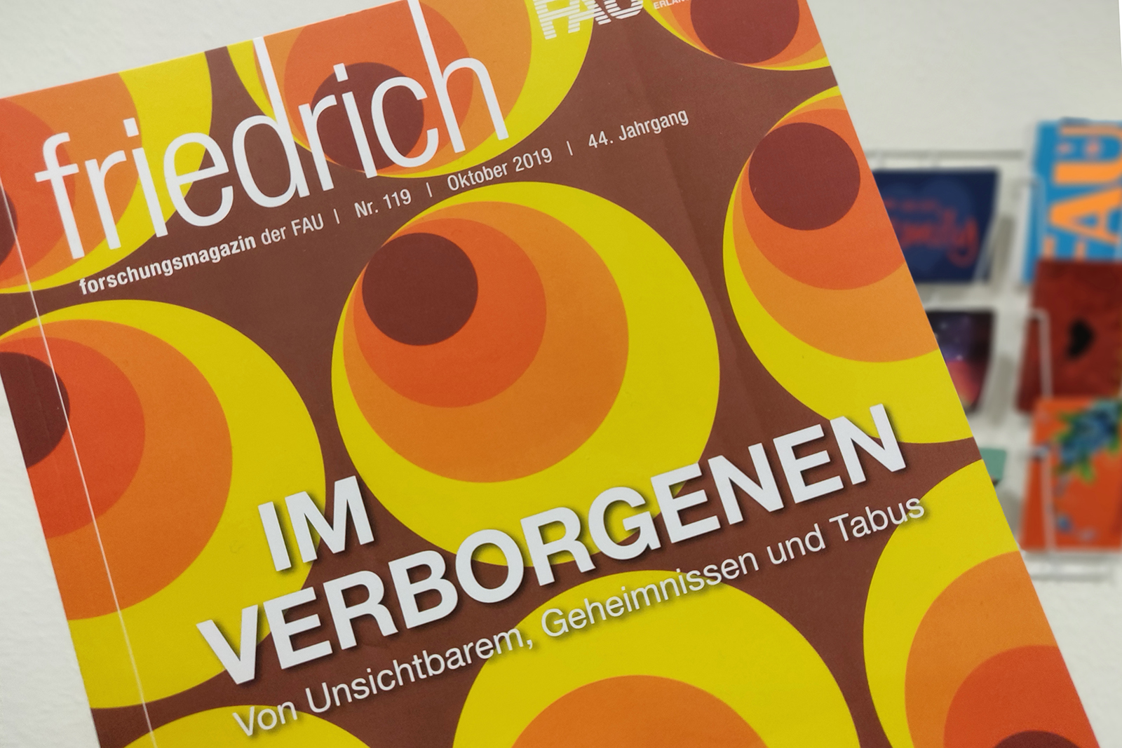 friedrich is FAU’s research magazine and is published once a year. This year´s issues deals with all things hidden: things we lost sight of, objects too small for the bare eye to see. It also invites the reader to confront things they usually avoid: taboos. Some mechanisms we are not even aware of: Why do we behave the way we behave? Do advertisements influence us subconsciously? And then there are secrets – everybody has them. Even institutions do not make everything transparent to the public.