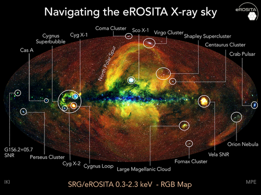 The first all-sky survey conducted by eROSITA is approximately four times deeper than the previous map of the entire sky in the x-ray band produced by the ROSAT telescope roughly 30 years ago, and has detected roughly ten times as many sources: approximately as many as have been discovered until now by all previous x-ray telescopes together. Whilst most classes of astronomical objects emit x-rays, the hot and energetic universe looks quite different than through optical or radio telescopes. Outside our home galaxy, most eROSITA sources are active cores of galaxies at cosmological distances where supermassive black holes accrete matter. Then there are also galaxy clusters which appear as extended x-ray halos, shining due to the hot gas included in the huge concentrations of dark matter. The map of the entire sky also unveils the smallest details of the structure of the hot gas in the Milky Way as well as the circumgalactic medium surrounding it. Understanding the properties of this medium is crucial for us to understand the history of the creation of our universe. The eROSITA x-ray map shows even more, however: Stars with strong, magnetically active hot coronae, x-ray binaries, which include neutron stars, black holes or white dwarves, and spectacular remnants of supernovae in our own and other nearby galaxies such as the Magellanic Clouds.
