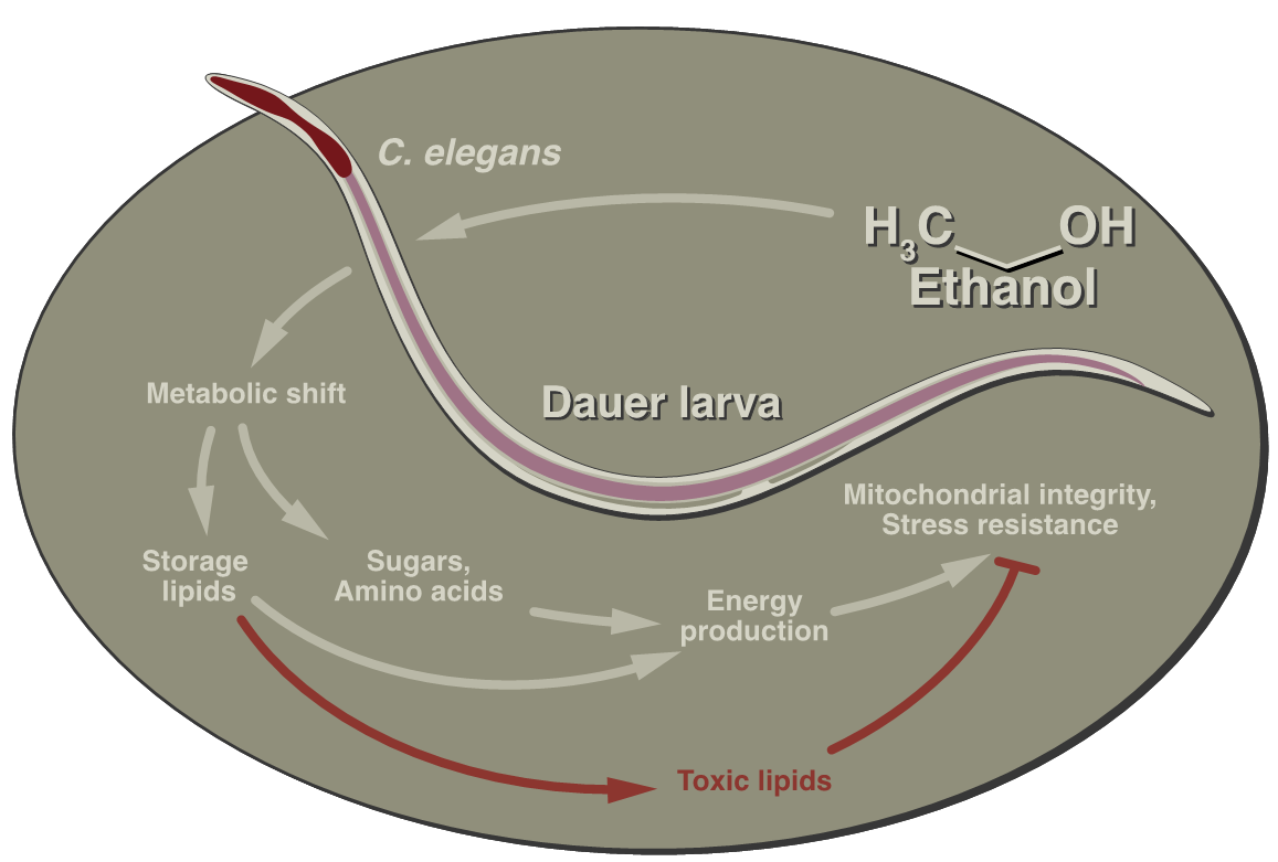 There are up to 40,000 different species of nematodes, or roundworms, living in soil around the globe. The worm Caenorhabditis elegans (C.elegans), which serves as a model organism for biology research, can adjust its development in response to a lack of food, over-population or extreme temperatures. They become what is known as dauer larvae, a special type of non-feeding larvae which remains shut off from the surrounding environment and can survive approximately four weeks without food. For a long time, biologists believed that the dauer larvae were a closed system which scarcely exchanged any material with the surrounding environment. By chance, however, the team of researchers discovered that dauer larvae which were kept in an alcoholic solution survived much longer than those which were not.