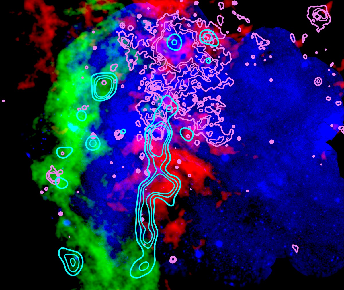 In the image, the two colliding atomic hydrogen components (cold gas) are shown in green and red, while the X-ray emission observed with XMM-Newton (hot plasma) is shown in blue. The image also shows H-alpha emission from the gas which was ionised by the massive stars, shown as magenta contours and the emission from molecular clouds (high-density regions harbouring new star-forming regions) shown as cyan contours.