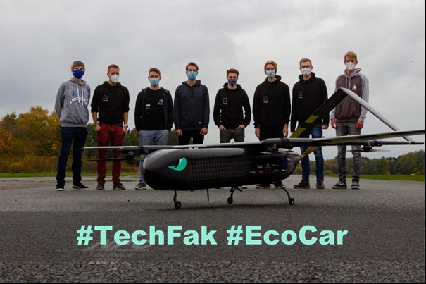 The EcoCar team has been developing vertical take-off electric rotor aircraft for four years. They won the 2020 New Flying Competition (NFC) in Hamburg with their current copter, which is called Night Fury. In this international competition for students, teams have to design and build long-range drones that are capable of meeting the challenges of the future. These include the capacity to fly in heavily built up airspace, for example when drones are used for transportation in cities. Vertical take off and landing was therefore one of the requirements of the competition.