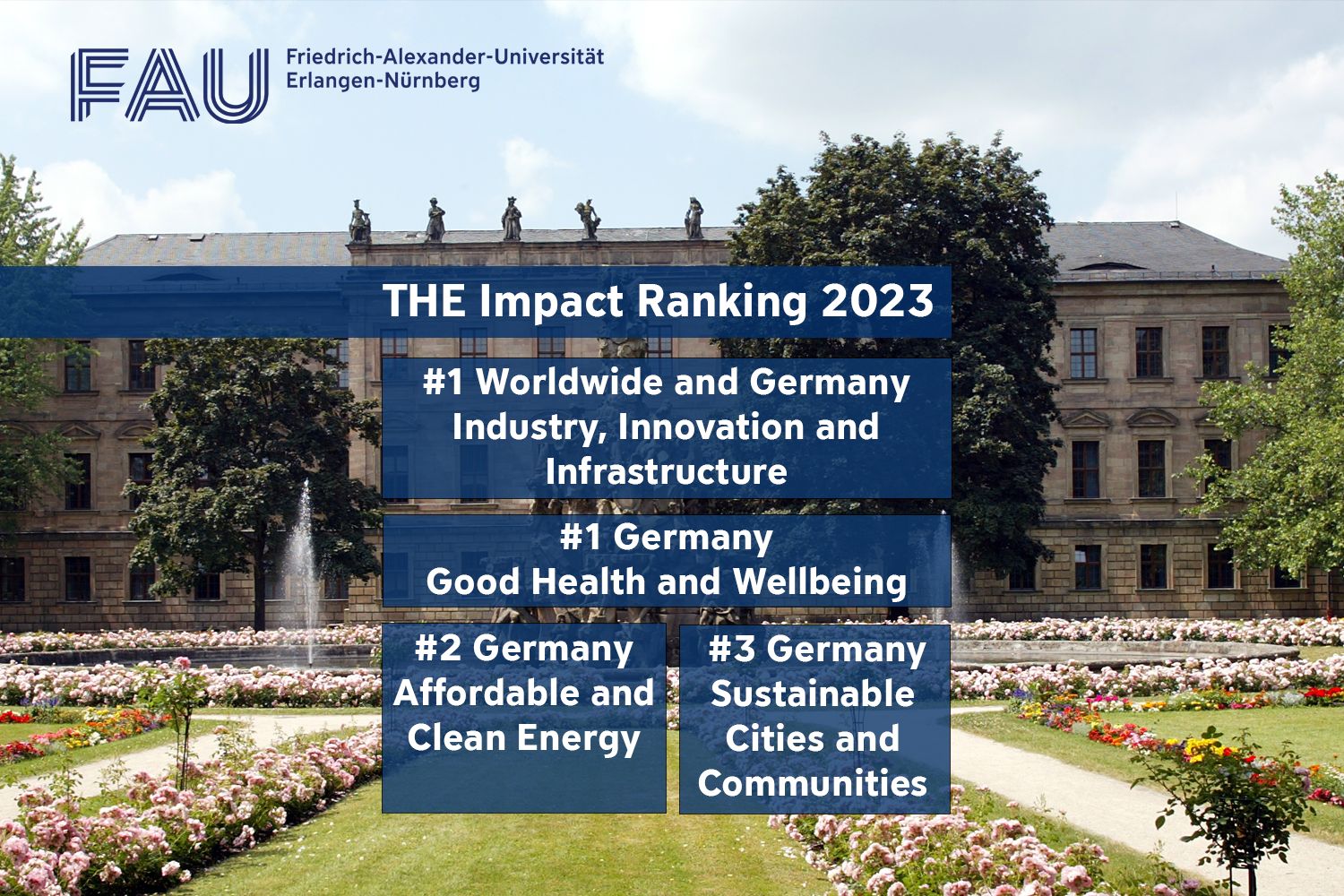 As one of the most innovative universities, it was easy for FAU to gain full marks in sustainability and reach the top position. In the “Industry, innovation and infrastructure” category, cooperations with industry, third-party funding and patents, initiatives such as the Digital Tech Academy, Josephs, Zollhof and the FAU Start-up Service that promotes innovative start-ups at the University were decisive factors for this outstanding result.