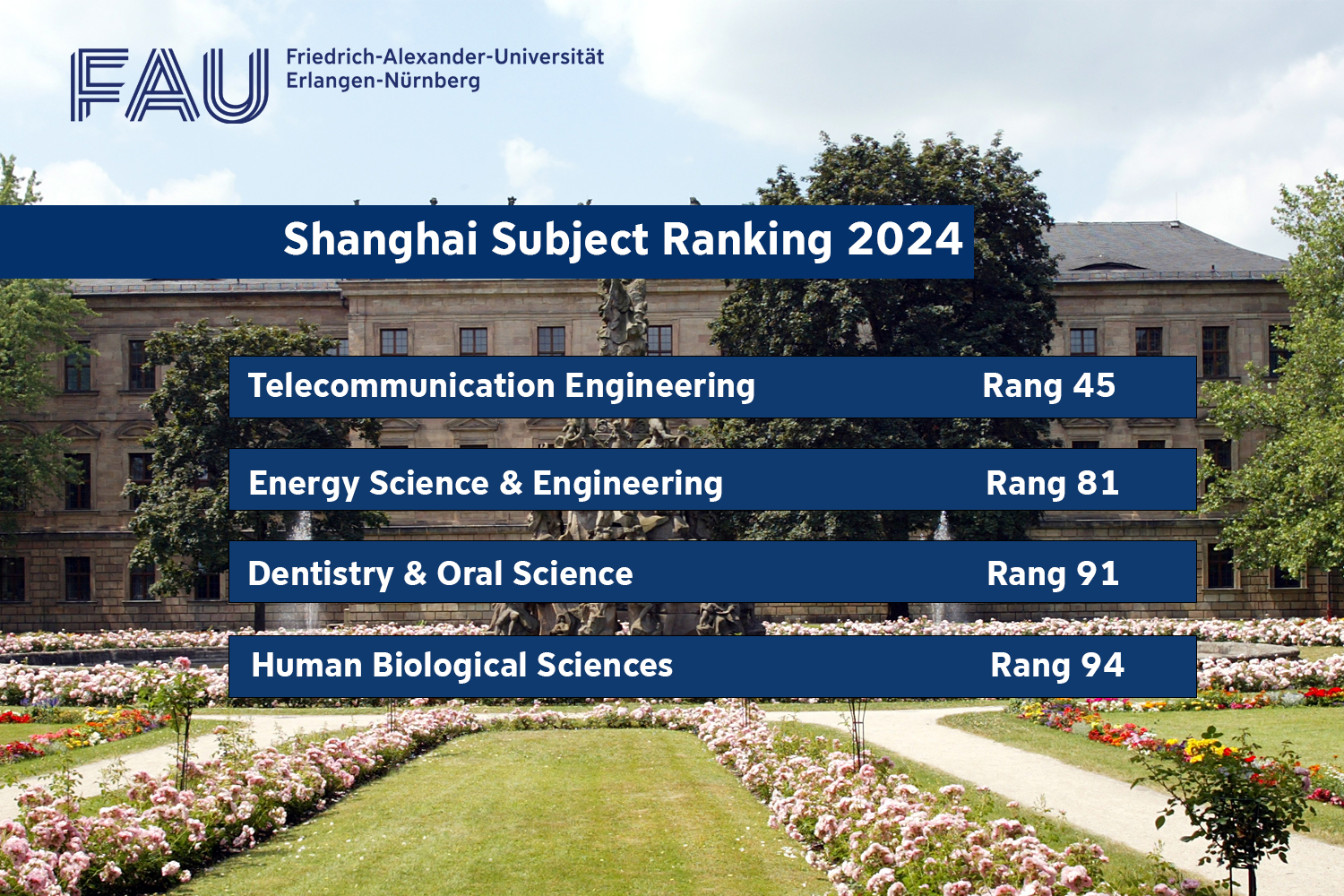 FAU is listed among the 100 most prestigious universities in the world in four subjects. In Germany, FAU even managed to jump into the top 10 in seventeen subjects. A total of more than 5000 universities all over the world were evaluated in the ranking.