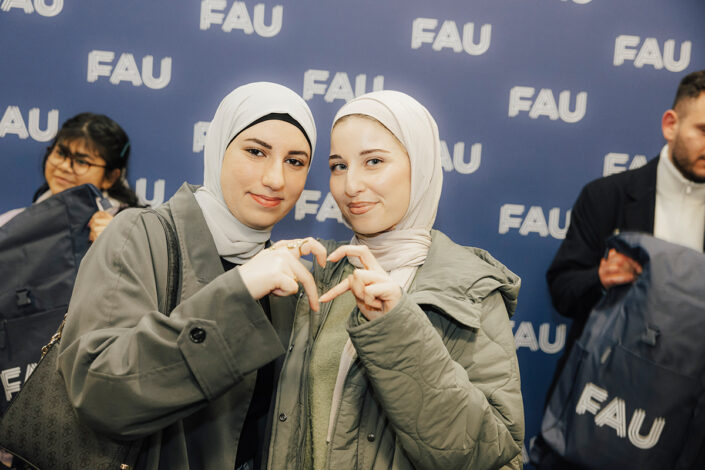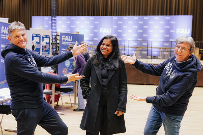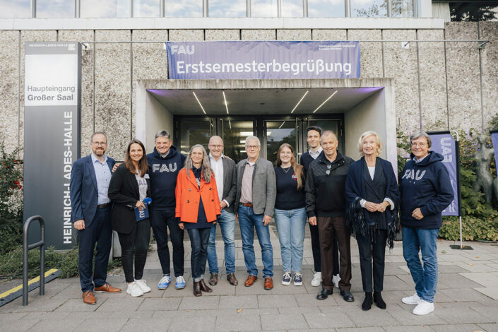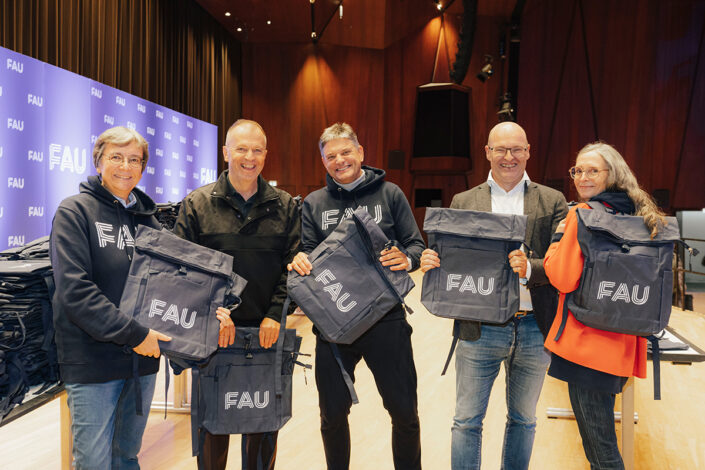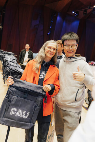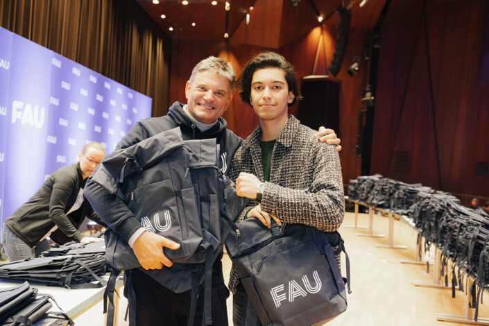 Every year, FAU welcomes its new students with the FAU Freshman Welcome Ceremony in the Heinrich-Lades-Halle in Erlangen and on the WiSo campus in Nuremberg. In Erlangen, the president and the university management welcomed the new freshmen, there was a DJ set and: The new FAU backpacks! In addition, all important contact persons were available to answer questions to ensure a successful start to your studies at FAU.